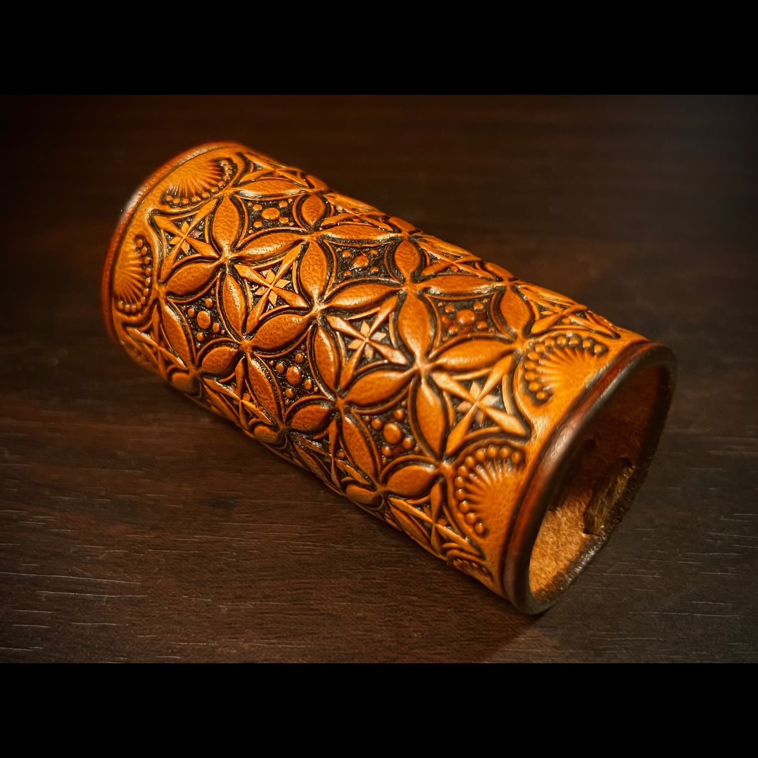 しっかりとした厚みのある本革を使用し、全面に立体感のある刻印を一つづつ施し染色して仕上げてあります。