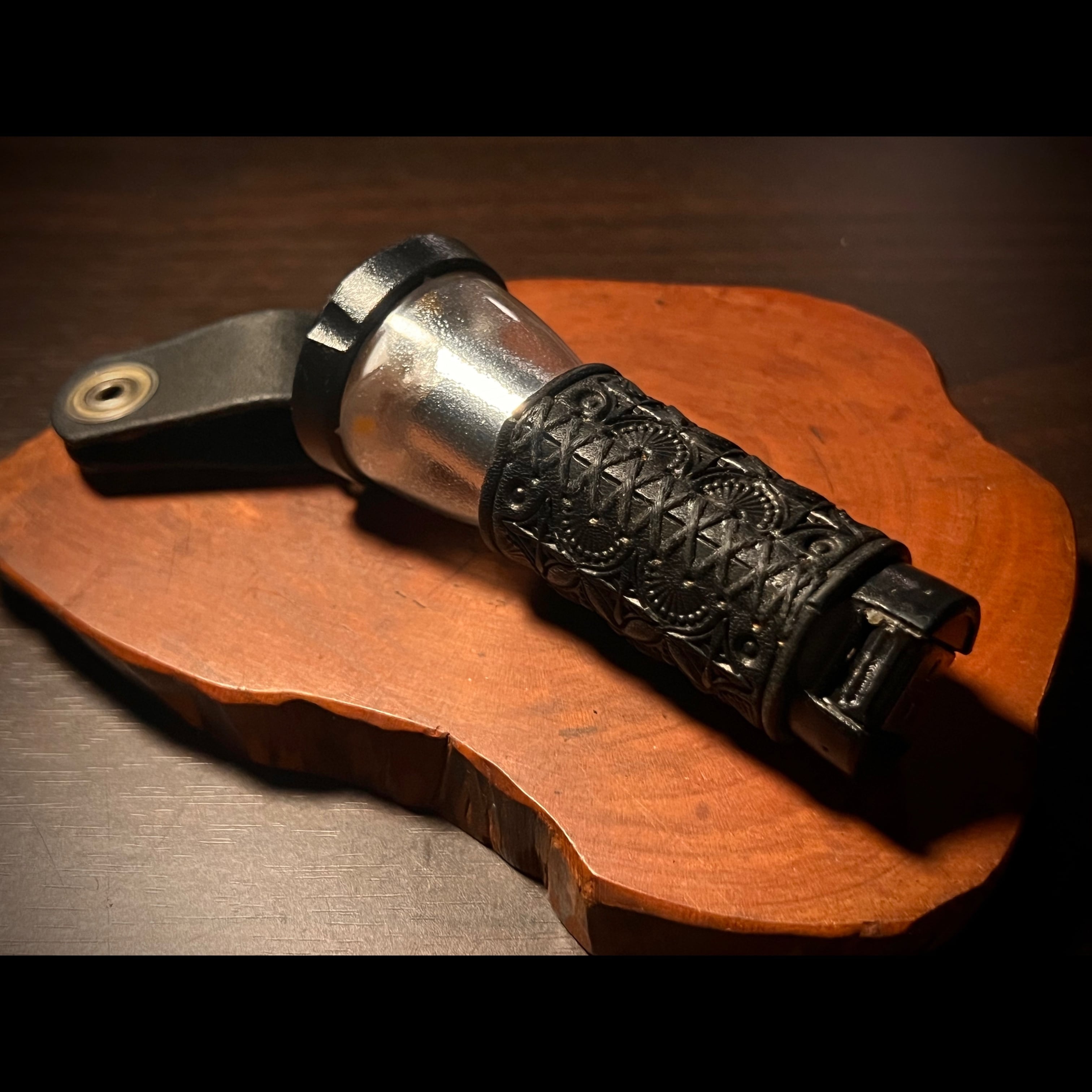 ヌメ革をブラックに染色し、立体感のある刻印を施しました。